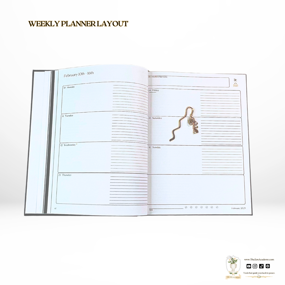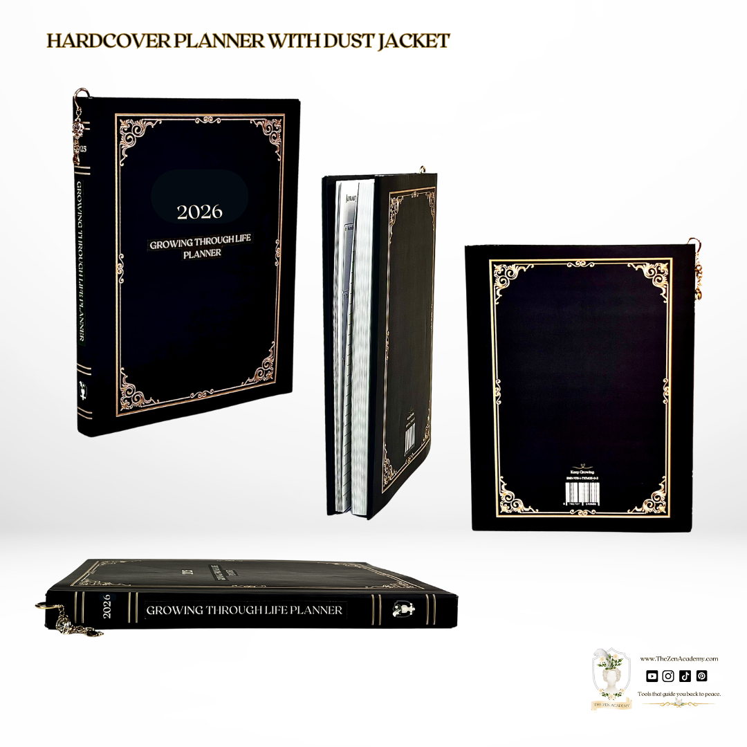 This hardcover version of the 2026 Growing Through Life Planner features a sleek dust jacket with a Black Linen cover underneath. For an additional fee we can personalize your planner with your initials hand etched into your planner's bottom right corner in gold foil.   Designed for those who appreciate design and functionality, this planner invites you to move through 2026 with confidence, clarity, and intention.